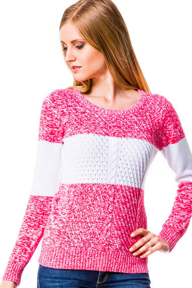 Яркий свитер из вязаного полотна с крупной фактурой. Модель с длинными рукавами и большой круглой горловиной. Выполнен из яркой розовой пряжи в сочетании с белоснежными вставками. Манжеты и низ изделия отделаны фактурной резинкой в рубчик.