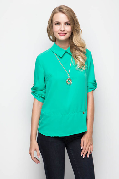 ОписаниеЯркая зеленая блуза из полиэстера, с застежкой на пуговицах с задней стороны изделия и классическим воротником. Длина рукава модели регулируется. Бижутерия в комплекте!